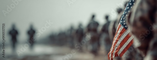 Soldiers marching with American flag at Memorial Day, banner with blurred background