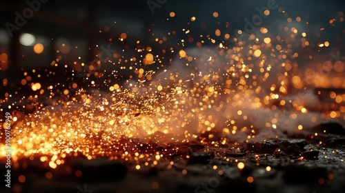 Metal sparks fly in a dark workshop during intense metalworking process at night