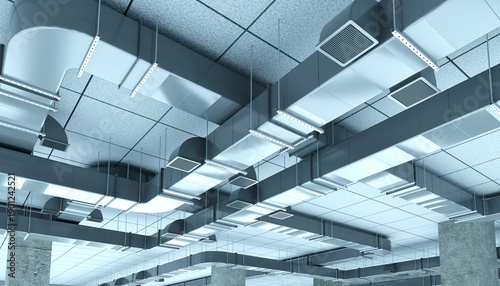 HVAC installation services, Building engineering. Complex network of ceiling-mounted air ducts, diffusers, and ventilation units installed for climate control in commercial interiors, 3d image