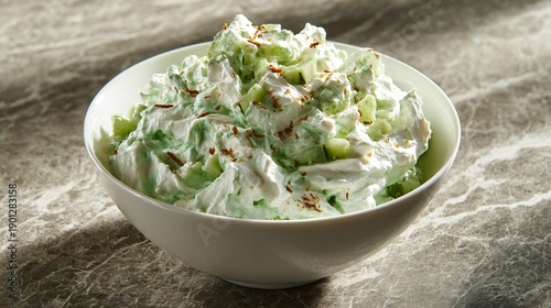 Watergate salad photographed at midday with crisp natural shadows, stone countertop