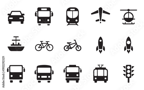 Set of black vector icons for various modes of transportation including car, bus, train, airplane, helicopter, and bicycle