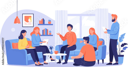 People gather in a living room, discussing and interacting casually