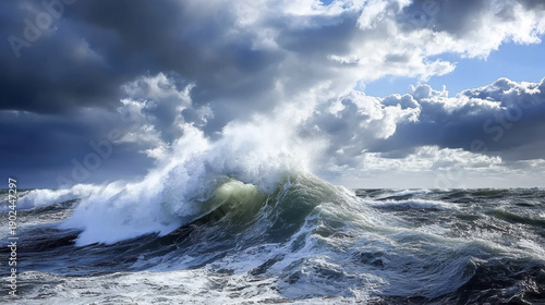Majestic ocean waves crash against rocky shore under dramatic sky filled with clouds, creating powerful and serene atmosphere