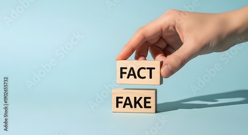 Hand placing wooden block with 'fact' on top of 'fake' symbolizing truth and deception