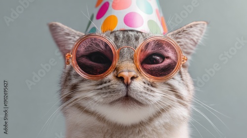 Stylish cat in party hat and sunglasses looking cool and trendy.