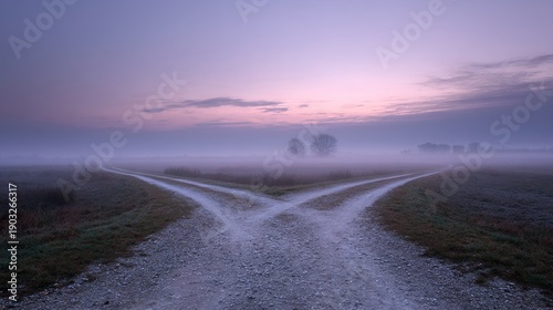 destiny. A mysterious foggy crossroads splits into two paths, evoking a sense of choice and adventure. wellbeing guides, coaching materials, designed for coaching and self-improvement content.