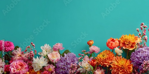 Floral Symphony: Vibrant blooms cascade on a calming turquoise backdrop, a celebration of nature's artistry.