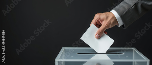 Casting vote transparent ballot box symbolizes civic duty and democracy. hand suit represents professionalism and engagement electoral process