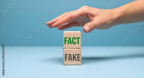 Fact vs. Fake: A hand delicately hovers over wooden blocks bearing the contrasting words Fact and Fake, symbolizing the critical choice between truth and falsehood. The scene is set against a soft.