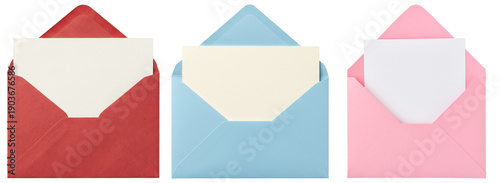 a clean photograph presenting three open colorful envelopes in red, blue, and pink, each holding a blank white card, ready for text.