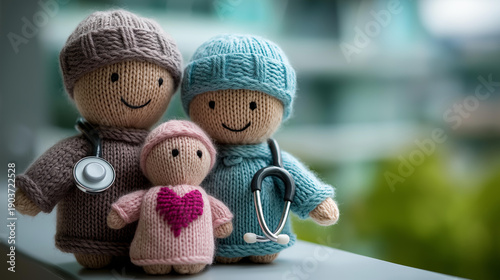 Soft knitted family figures, defocused healthcare illustration, family medicine clinics, insurance services, preventive wellness programs, conceptual health representation, with