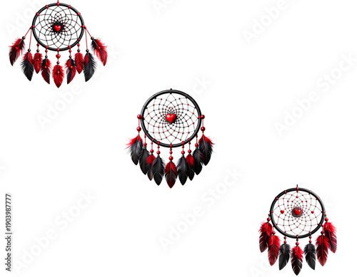 Three red and black dreamcatchers on transparent background