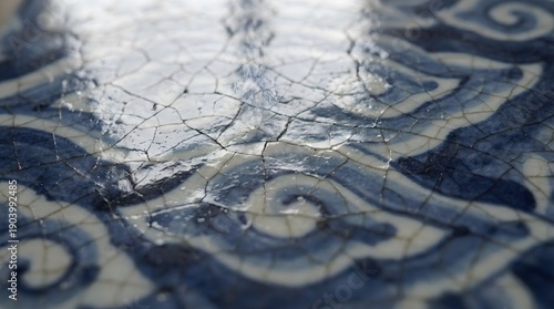 Close Up of Antique Mega Mendung Blue and White Ceramic with Crackle Glaze
