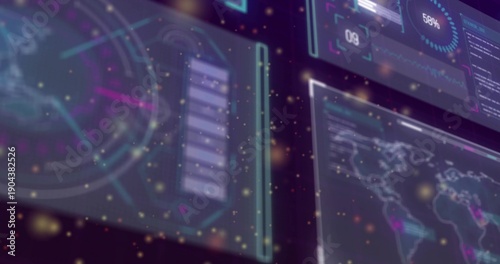 Floating translucent holographic panels showing HUD data in control room, with radar and world map