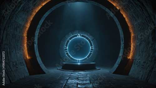 Futuristisches Sternentor in einer dunklen Tempelanlage mit Hieroglyphen
