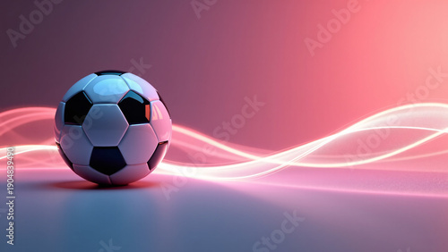 A soccer ball sits on a smooth surface as pink‑purple gradients glow behind it, with luminous light trails swirling gently, creating a modern, energetic, atmospheric fusion of sport and motion.