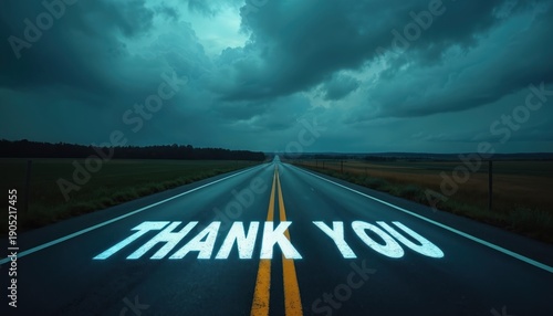Glowing Thank You text painted on dark asphalt highway. Dramatic stormy sky looms overhead. Open road leads towards horizon. Journey ends with appreciation.