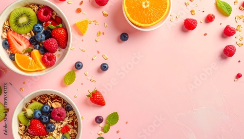 Fresh fruit and cereal bowls on a pink table with scattered berries and orange juice viewed from above