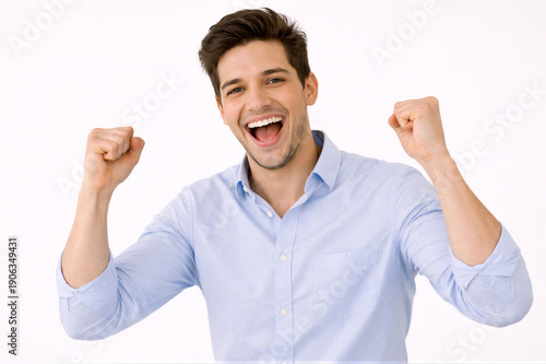 Radosny mężczyzna świętujący sukces – koncepcja motywacji i osiągnięcia celu