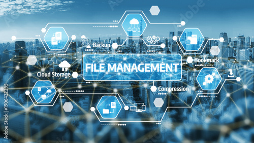 Innovative visualization of file management concepts featuring cloud storage, backup, compression, and bookmarks over a modern city skyline, showcasing technology integration. Tessel