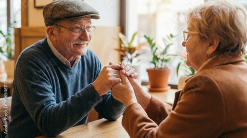 Happy senior couple holding hands in cozy cafe,emotional connection,retirement lifestyle,love and companionship concept representing trust,care,aging gracefully and family values
