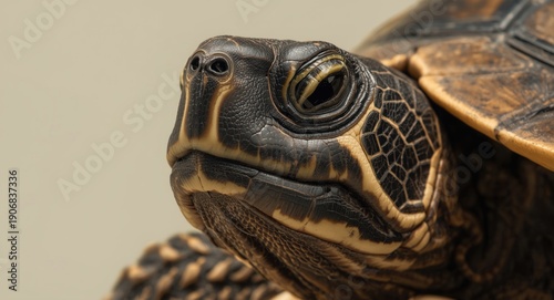 Detailed turtle head close up showcasing eyes beak and shell texture