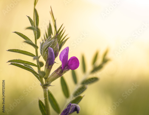 Artystyczne ujęcie makro dzikiej wyki ptasiej na ciepłym, złotym tle rozmytej łąki o zachodzie słońca.