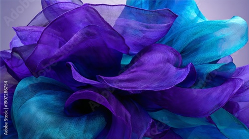 Colorful layers of translucent fabric in shades of purple and teal arranged artistically against a soft gradient background, showcasing texture and movement