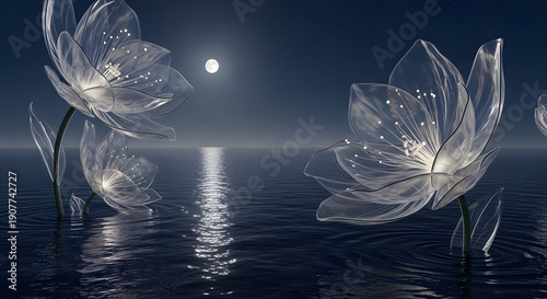Massive translucent lilies with glowing filaments rise from the sea surface reflecting the light of a full moon in a clear night sky