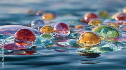 Close-up of Colorful Glass Water Droplets on Smooth Surface with Soft Focus