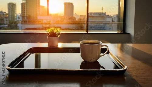 a single cup of coffee rests on a sleek tray atop a modern office desk bathed in the warm glow of morning sunlight streaming through expansive windows suggesting a calm and productive workday ahead