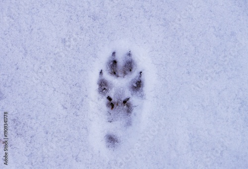 Pojedynczy ślad zwierzęcia odciśnięty w świeżym śniegu na leśnej ścieżce. Zimowa sceneria nawiązuje do tropienia, myślistwa i obecności dzikiej przyrody.