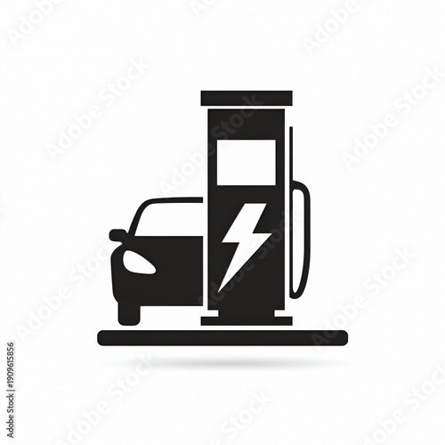 Ładowanie samochodu elektrycznego, stacja ładowania i elektromobilność, energia i transport przyszłości. Czarna ikona na białym tle.