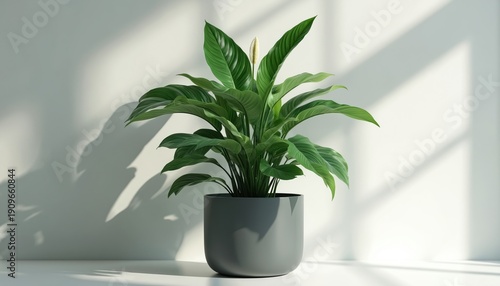 Green peace lily plant in a dark grey pot on a white surface. Lush foliage with broad leaves. Light casts soft shadows on the wall behind. Botanical element for calm interior design.
