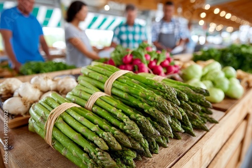Manojos de espárragos verdes atados con cuerda reposan sobre una mesa en un mercado interior con compradores al fondo.