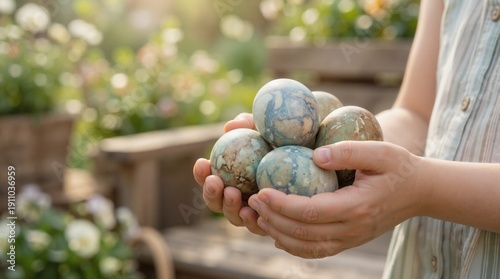 Child holding naturally dyed marbled Easter eggs in garden. Close up of hands with blue and brown patterned eggs. Spring holiday tradition