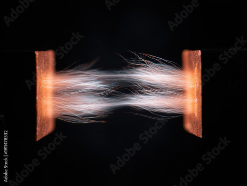 Electric sparks jumping between copper terminals in dark studio, showing dynamic energy flow and electrical discharge