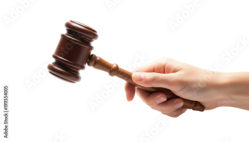 Hand holding a dark brown wooden judge's gavel with a smooth finish, isolated on white background
