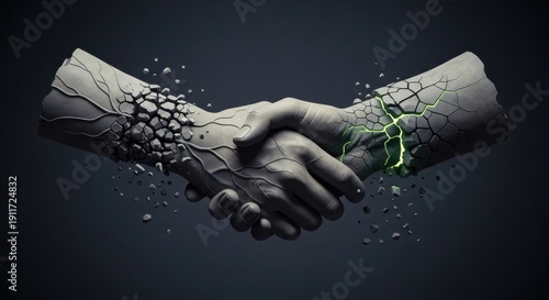 Hands shaking with cracked stone surfaces, one with sprouting green plant, symbolizing partnership and growth in a dark environment