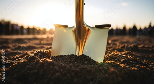 A shining golden shovel firmly planted in the rich earth, symbolizing a groundbreaking ceremony and the auspicious start of a new construction project, bathed in the warm glow of sunrise