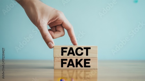 Hand pointing to stacked wooden blocks with fact and fake written on them