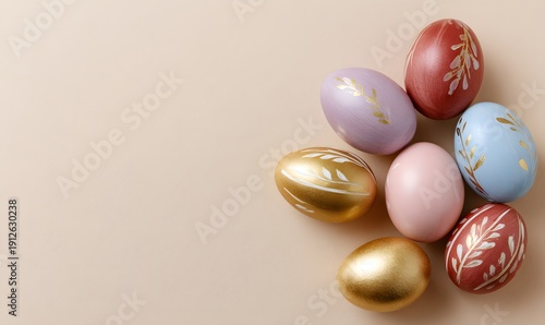 colorful easter eggs with golden patterns on a beige background