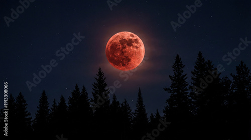 Large, glowing red blood moon during a total lunar eclipse in a dark starry night sky. Silhouette of a coniferous pine forest in the foreground creates a dramatic and celestial atmosphere.