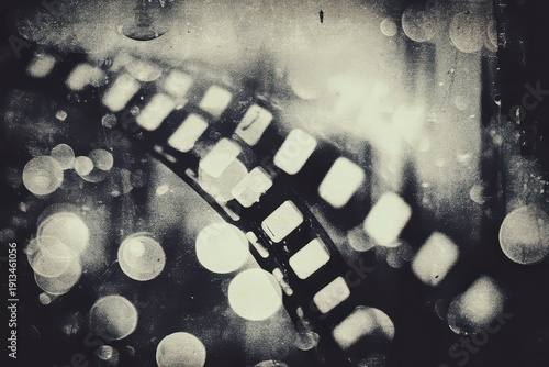 Abstract Black and White Spray Art with Overlapping Squares and Circles, Textured Surface, Dark Background, High Contrast, and Graphic Design Elements