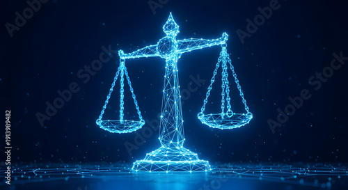 Digital scales of justice glowing wireframe representation | Futuristic legal system concept technology background | AI ethics and digital law compliance visualization | Plexus network symbolizing