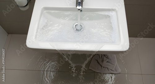 Bathroom sink overflowing with water onto the tiled floor. Running faucet causing a flood and water damage. Plumbing emergency concept