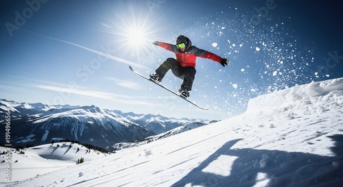 Starburst sun flare exploding snow aerial freestyle snowboarding winter action sport