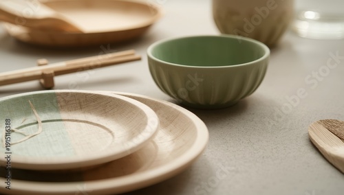 Sustainable single-use dining ware. Decomposable dishes for crafts. Recycling idea. Utilized in fast food, eateries, takeout, and outdoor meals. Close-up view