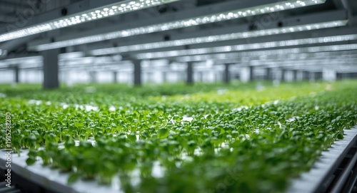 Microgreens prospering in a sustainable indoor farming environment with bright grow lights and tidy trays displaying vibrant green species