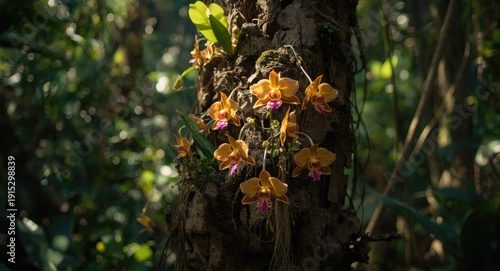 Tropical epiphyte orchids prospering on gnarled tree trunk in natural setting